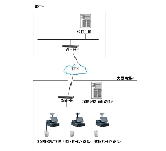 在本方案中通过在商户收银机上外接EMV密码键盘或POS即可实现银行卡受理,交易由商户收银系统发起,在EMV键盘或POS上完成银行卡收单交易数据的采集,通过商户内部网络经由商户与银行的专线将银行卡交易数据上送银行处理,银行处理完成后将交易数据返回到EMV键盘或POS终端,终端将把交易的结果反馈给商户收银系统完成交易。
