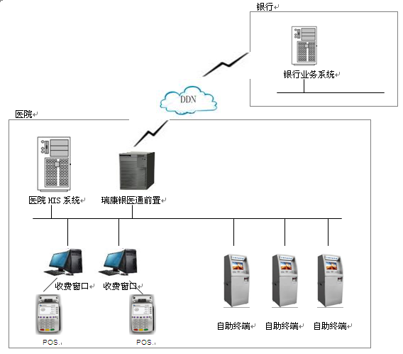 为了满足各大医院日益增长的缴费需求,缓解医院排队缴费困境,南京瑞康资讯有限公司提出银医通系统的解决方案,在本方案中银医通包括两个部分,一部分是窗口银行卡收费,一部分是自助终端银行卡支付。